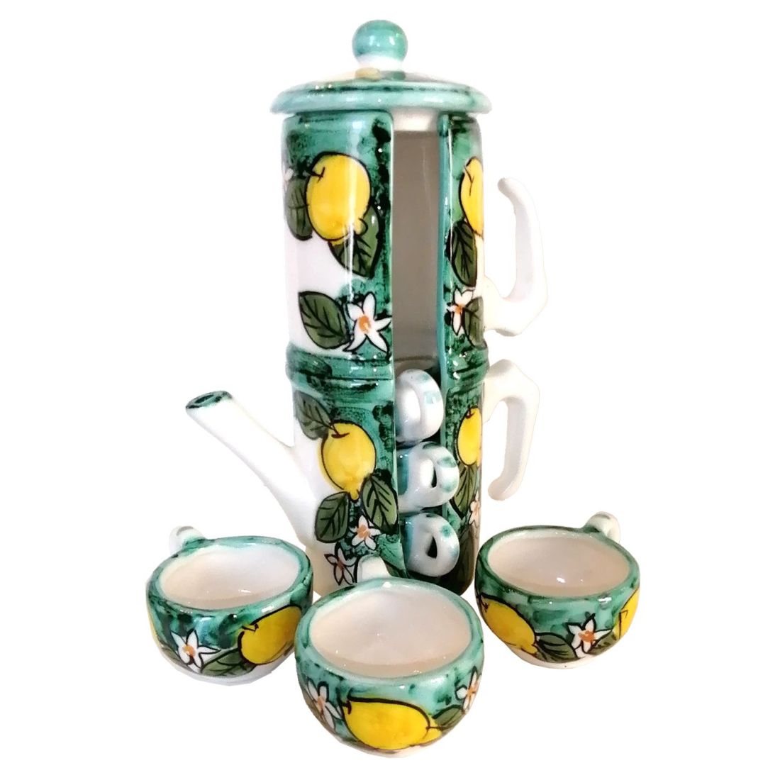 Bomboniera zuccheriera con tazzine fondo verde ramina. Ceramica di Vietri