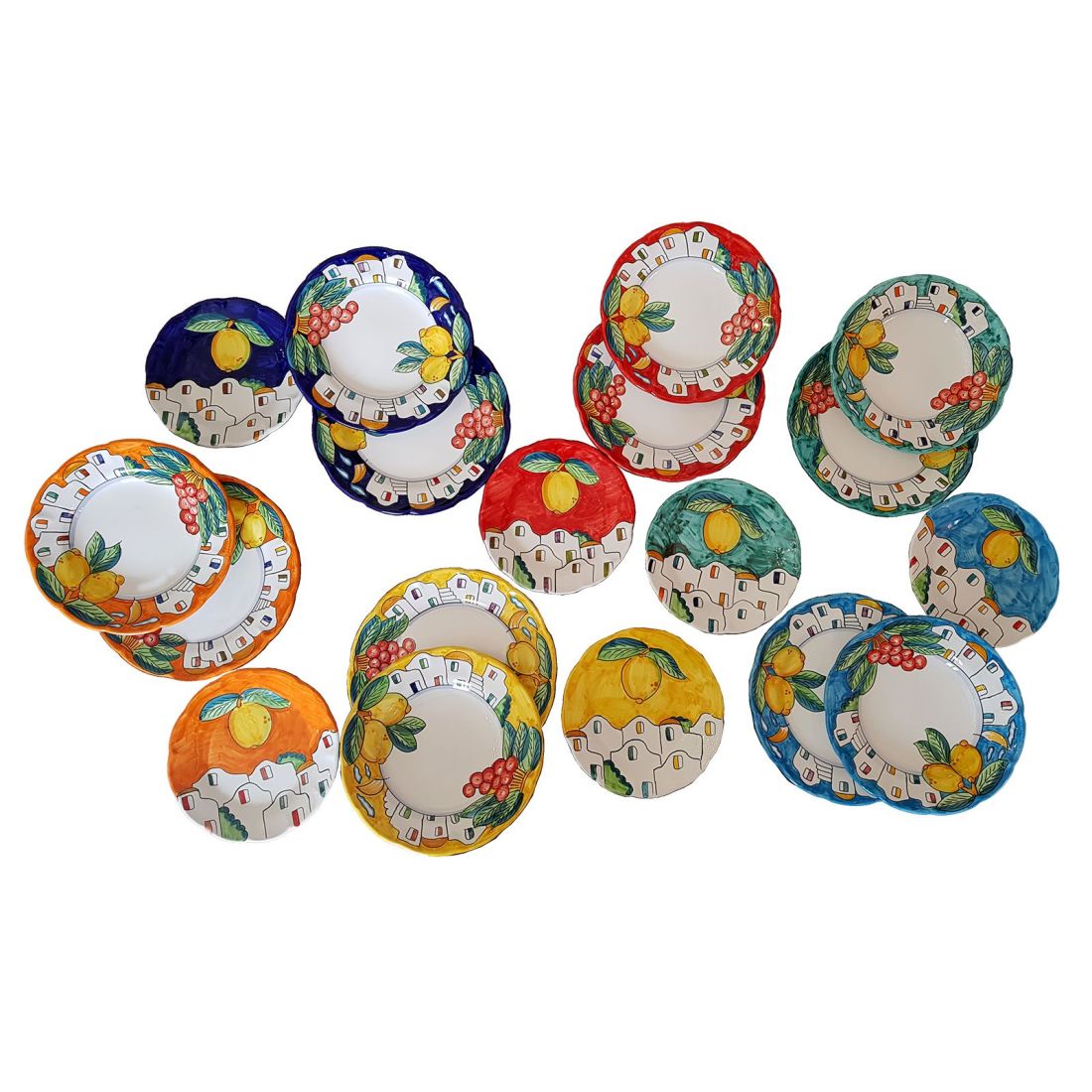 Drei Teller der Linie Home und Lemons. Vietri-Keramik, handbemalt – flacher Hintergrund und Früchte