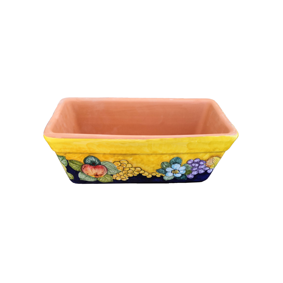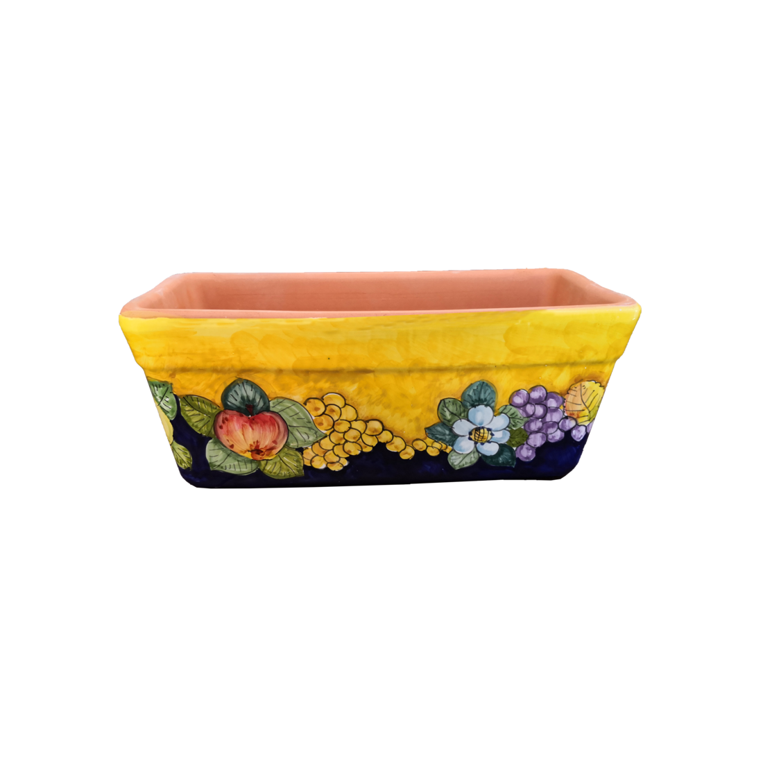 Rechteckiger Pflanzkasten. Gelber Grund mit Trauben, Granatäpfeln und Blumen. Vietri-Keramik. Handbemalt.