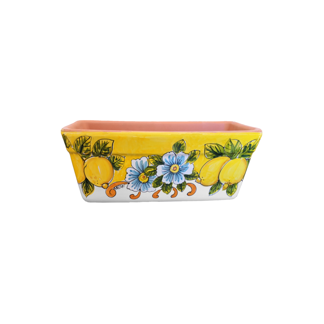 Rechteckiger Pflanzkasten. Gelber Grund mit Blumen und Zitronen. Vietri-Keramik. Handbemalt.