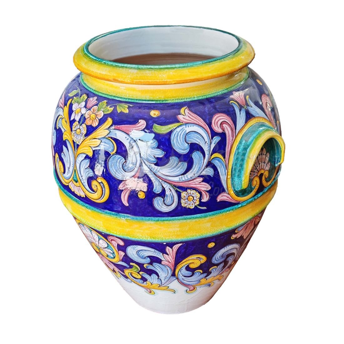 Schirmständervase mit glattem Rand, blauem Boden und Barockdekor, aus handbemalter Vietri-Keramik.