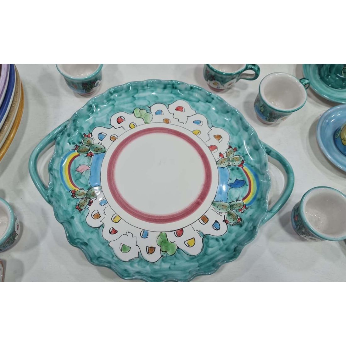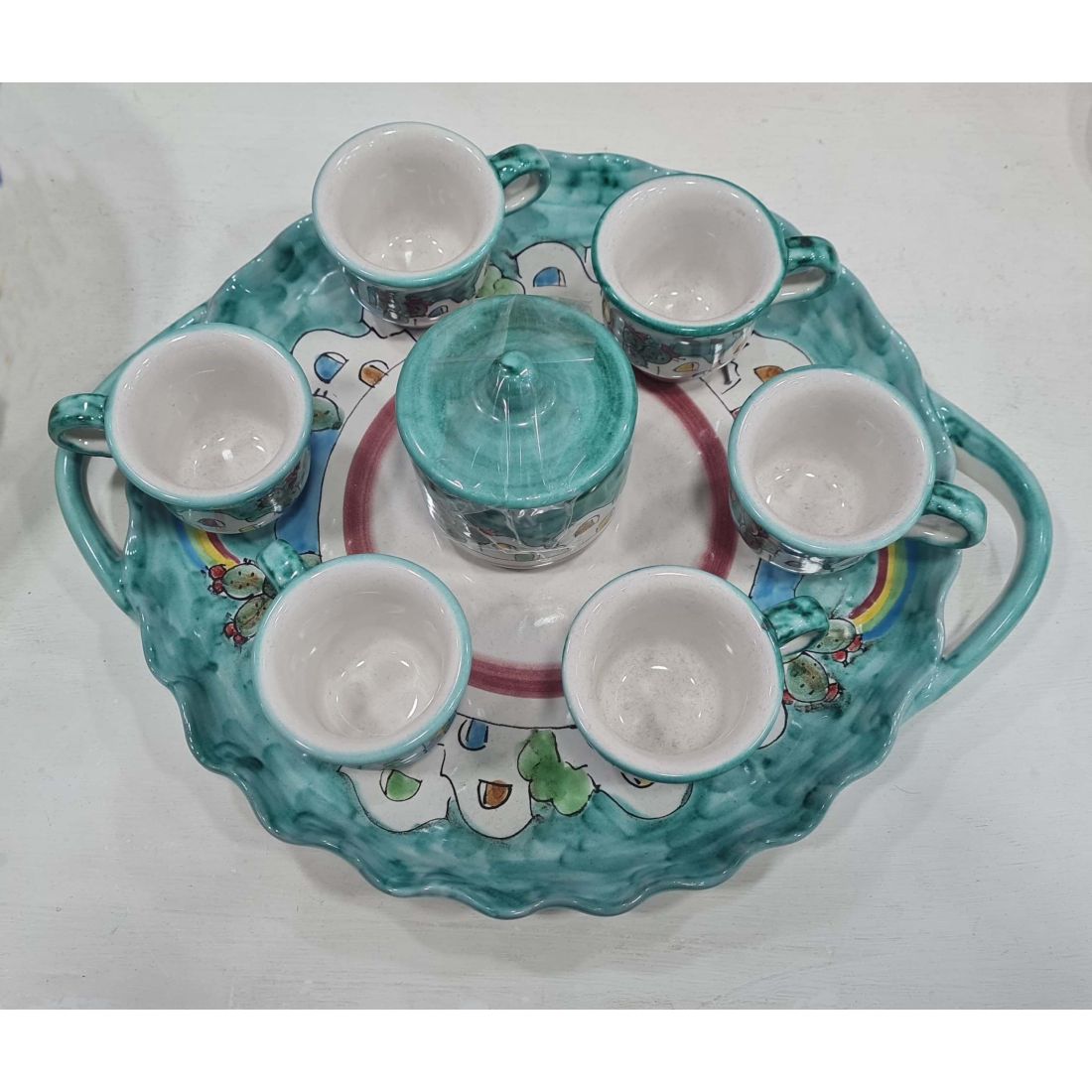 Tablett mit 6 Tassen und Zuckerdose. Linie Casette. Vietri-Keramik. Handbemalt.