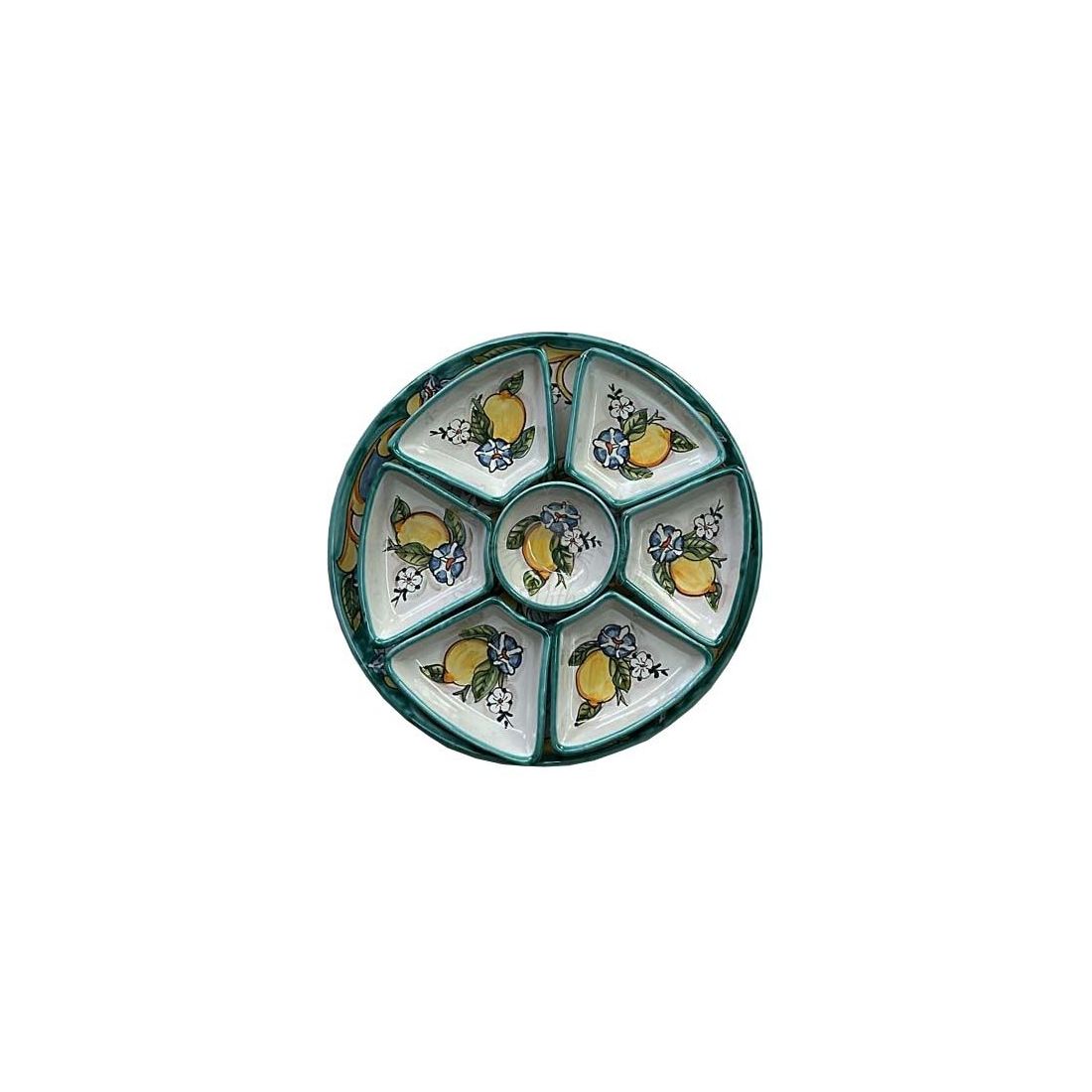 Antipastischale. 8-teiliges kaltes Abendessen. Zitronenlinie. Handbemalte Vietri-Keramik.