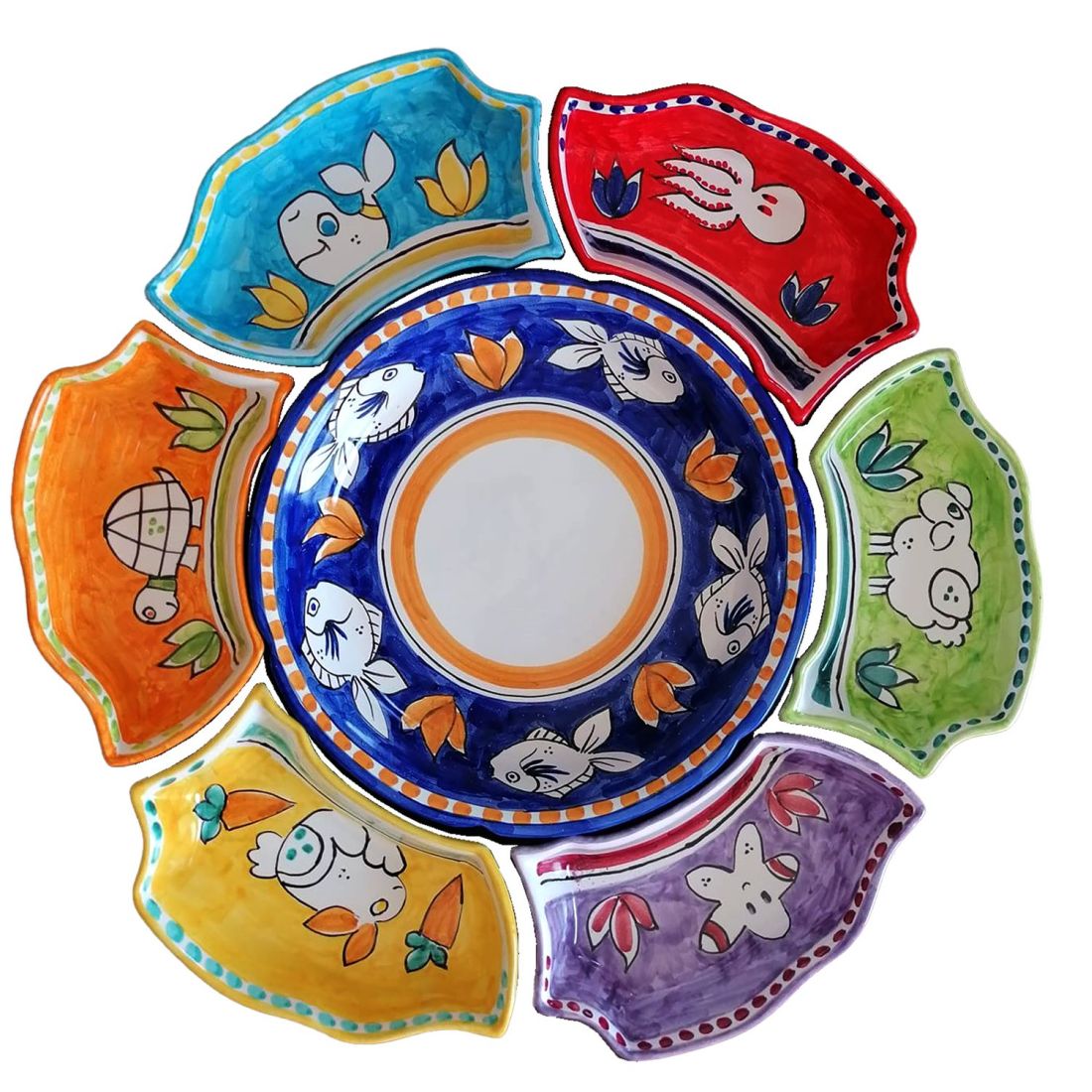 Antipastischale. Kaltes Abendessen. 7 Teile. Tierchen-Linie. Handbemalte Vietri-Keramik.