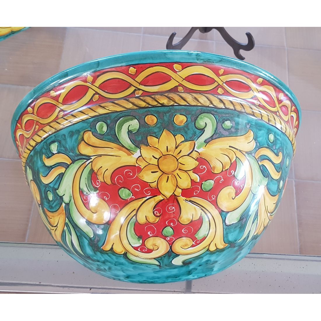 Gerla liscia porta pianta decoro barocco fondo verde ramina. Ceramica di Vietri dipinta a mano.