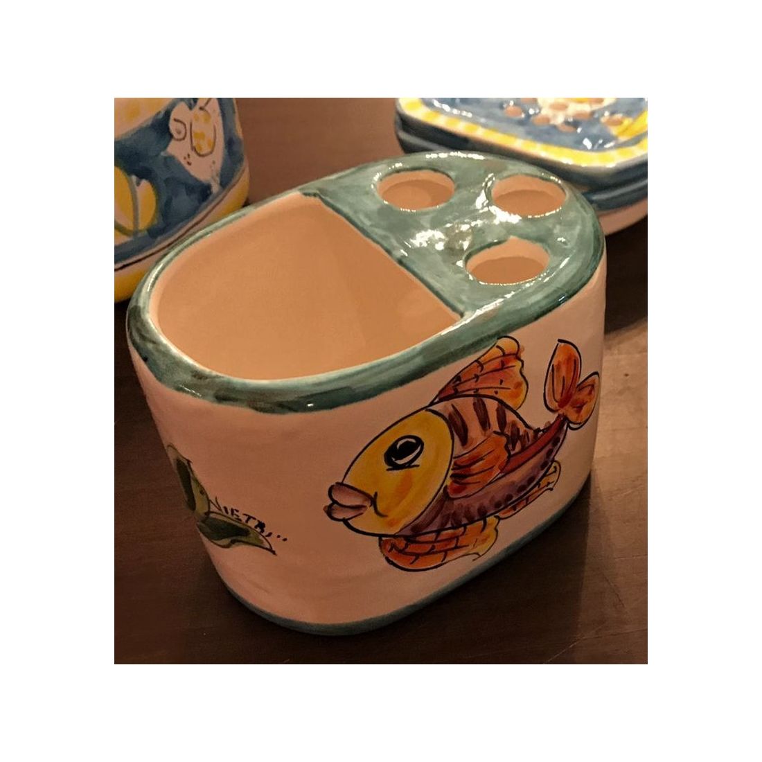 toothbrush holder fish copper green. handpainted Vietri ceramic