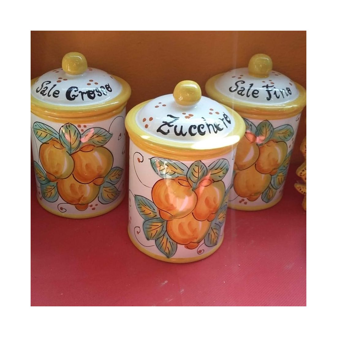 Set of Jars coloured lemons line white Background. handpainted Vietri ceramic