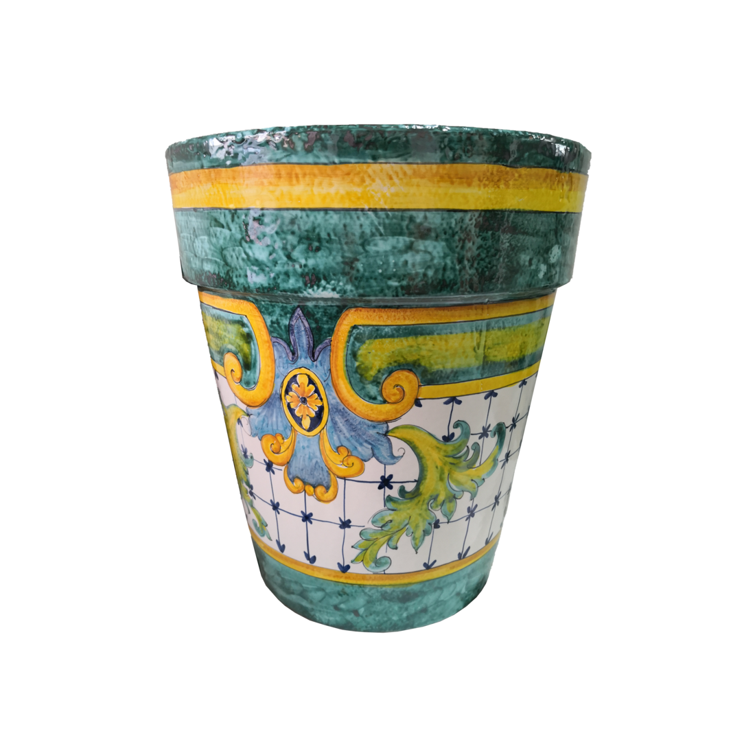 Conical pot for plants Copper green background. handpainted Vietri ceramic