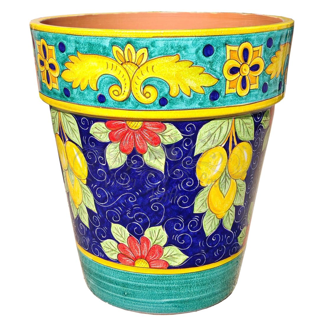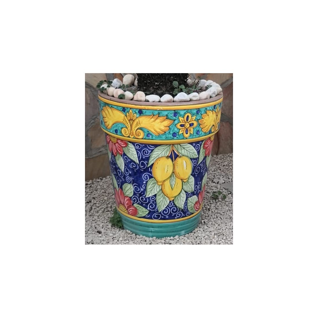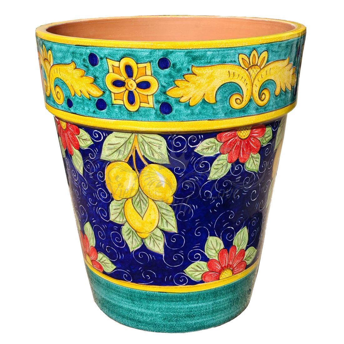 Conical pot for plants Blue background, lemons. handpainted Vietri ceramic