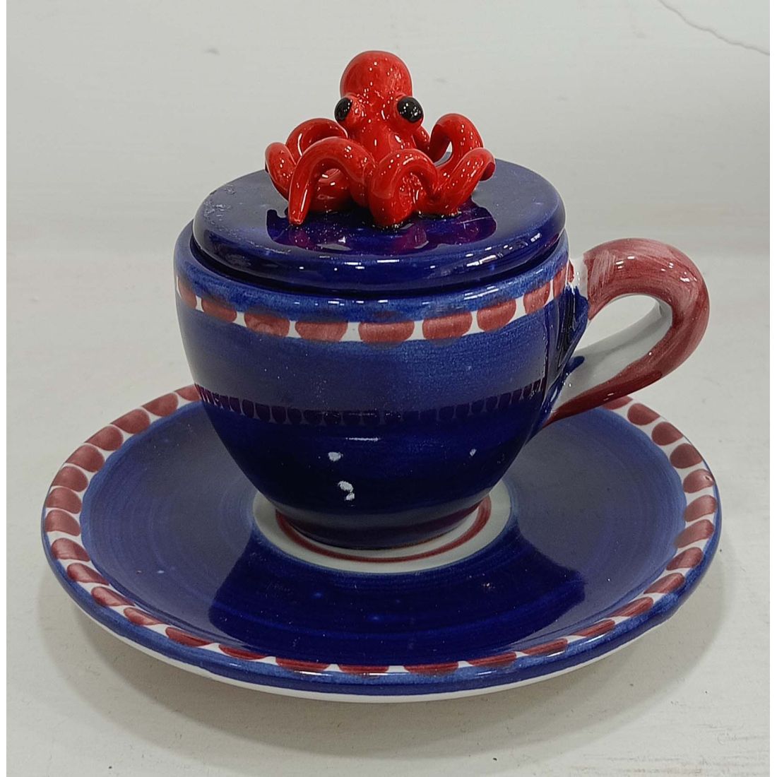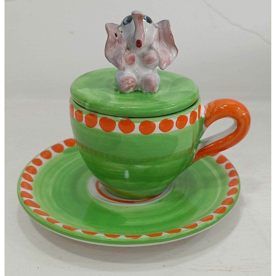 Coffee cup with saucer and lid. Little Animals Line. Vietri ceramic. Hand-painted.
