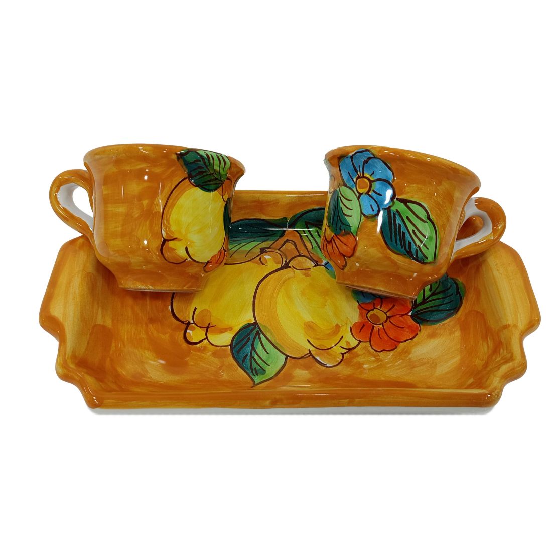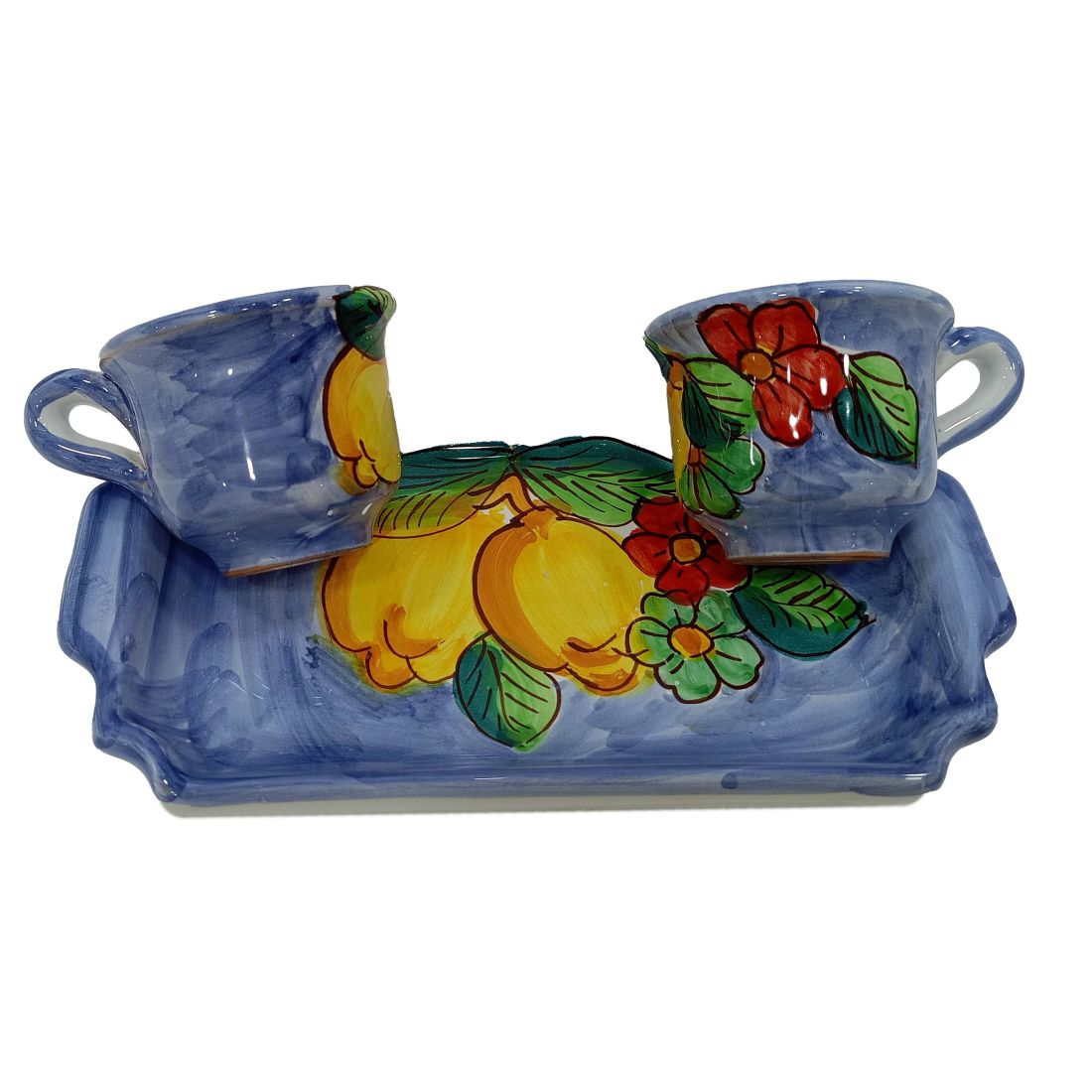 The Tet-a-Tet Set includes two cups with matching tray, entirely handcrafted and hand-painted according to the ancient tradition of Vietri Ceramics. Each detail is created with care and skill, making every piece unique and unrepeatable.