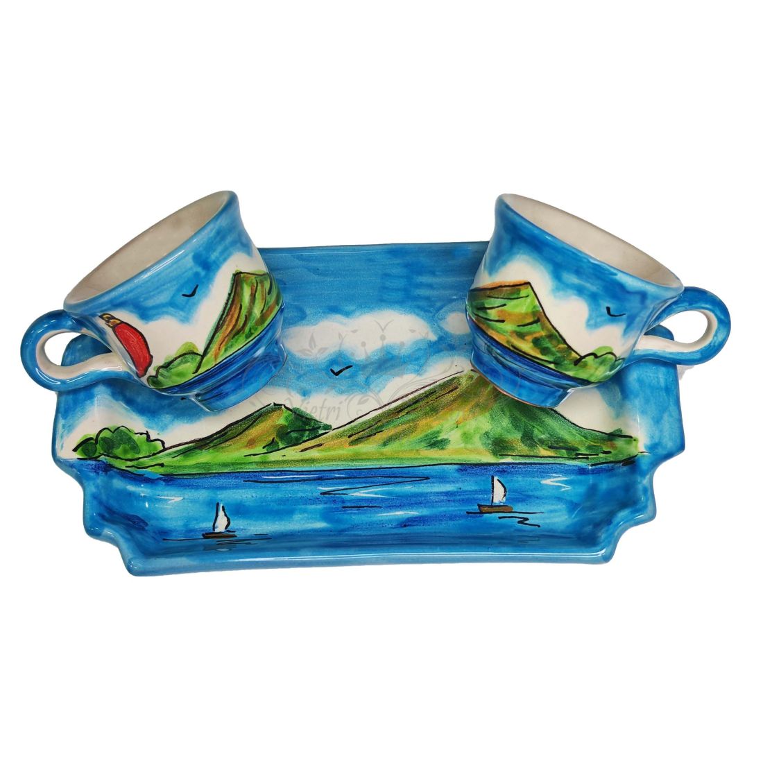 The Tet-a-Tet Set includes two cups with matching tray, entirely handcrafted and hand-painted according to the ancient tradition of Vietri Ceramics. Each detail is created with care and skill, making every piece unique and unrepeatable.