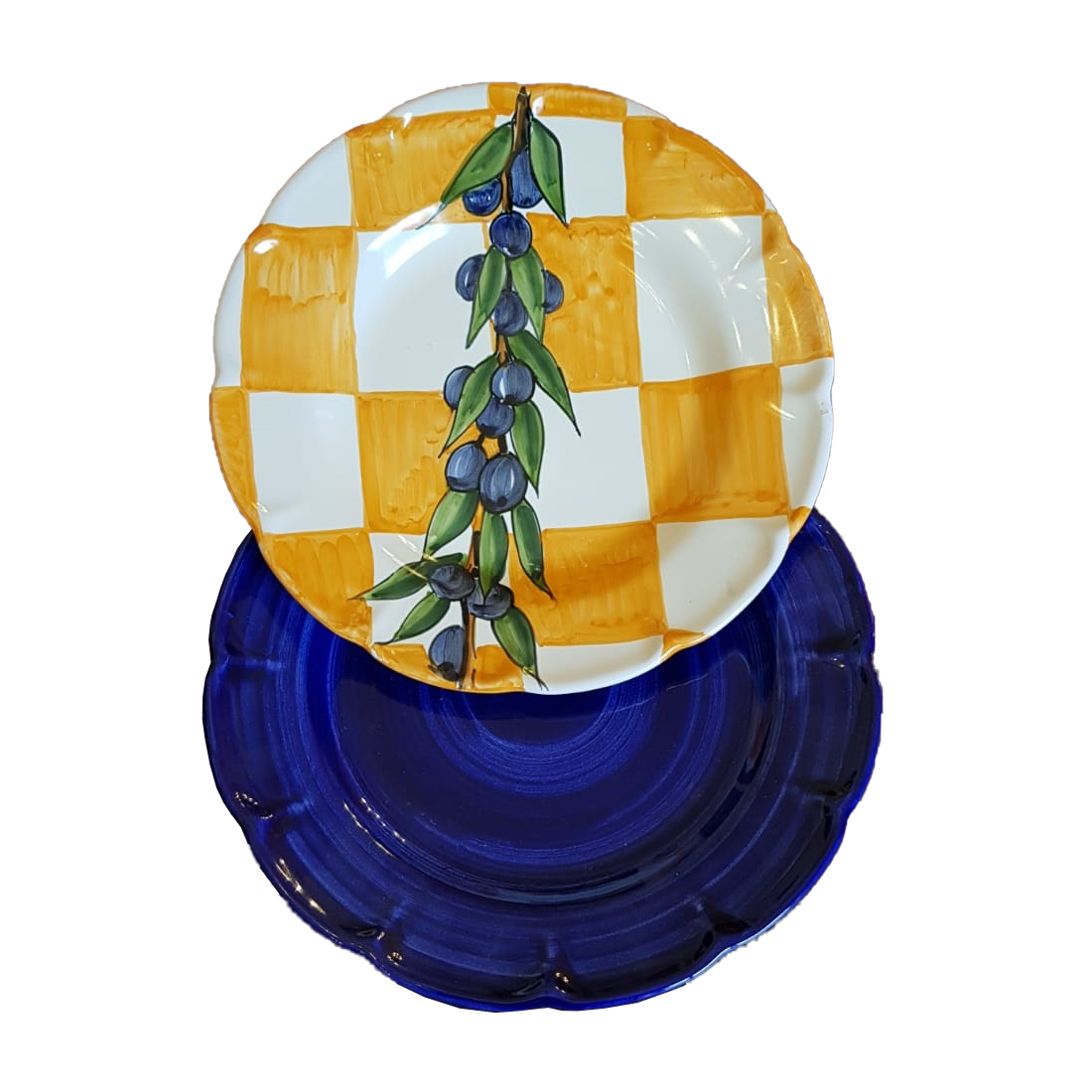 Dishes, Plates handpainted Vietri ceramic Stripes and olive line brushed blue - Bis Soup and dinner plate