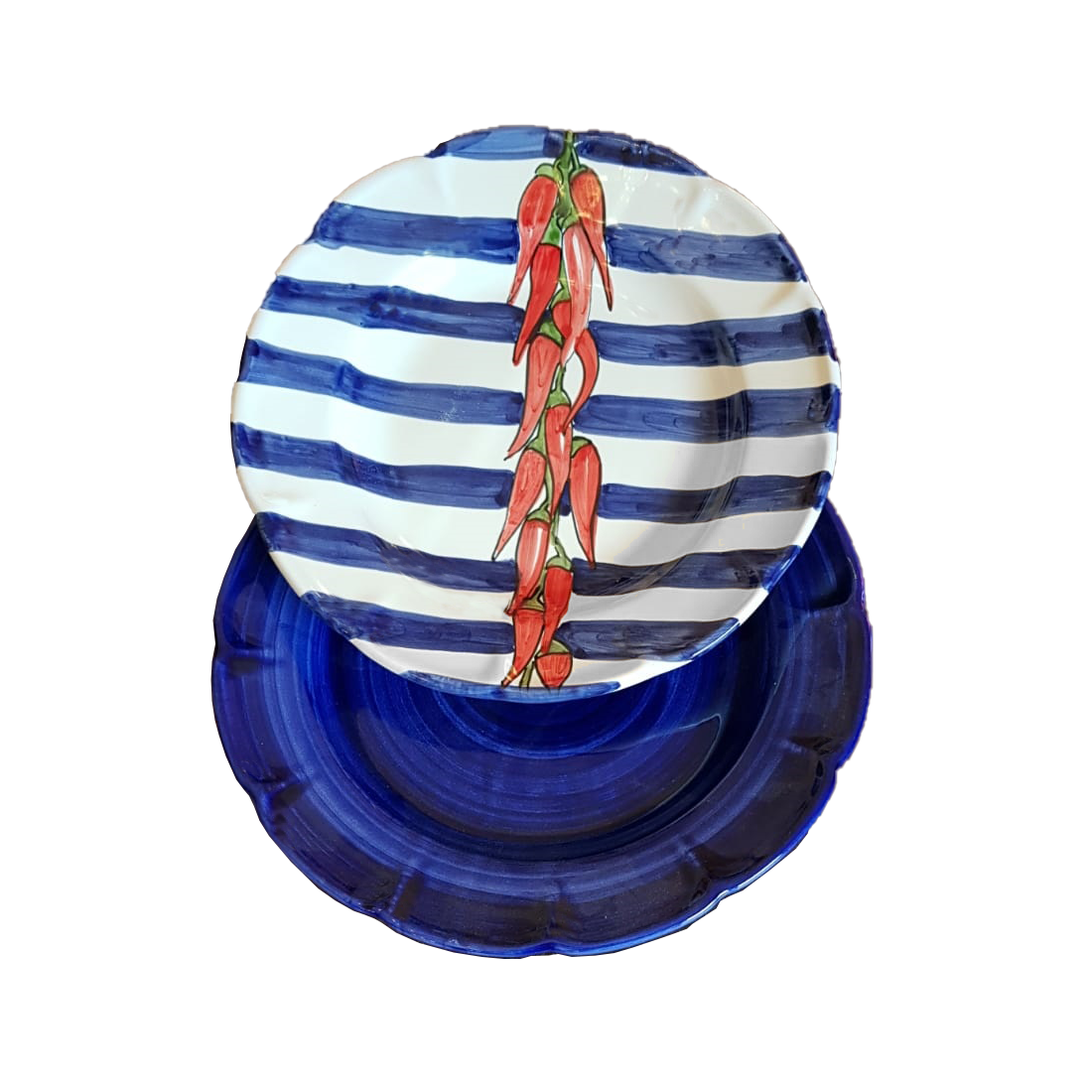 Dishes, Plates handpainted Vietri ceramic stripes and chili pepper line, brushed blue- Bis Soup and dinner plate