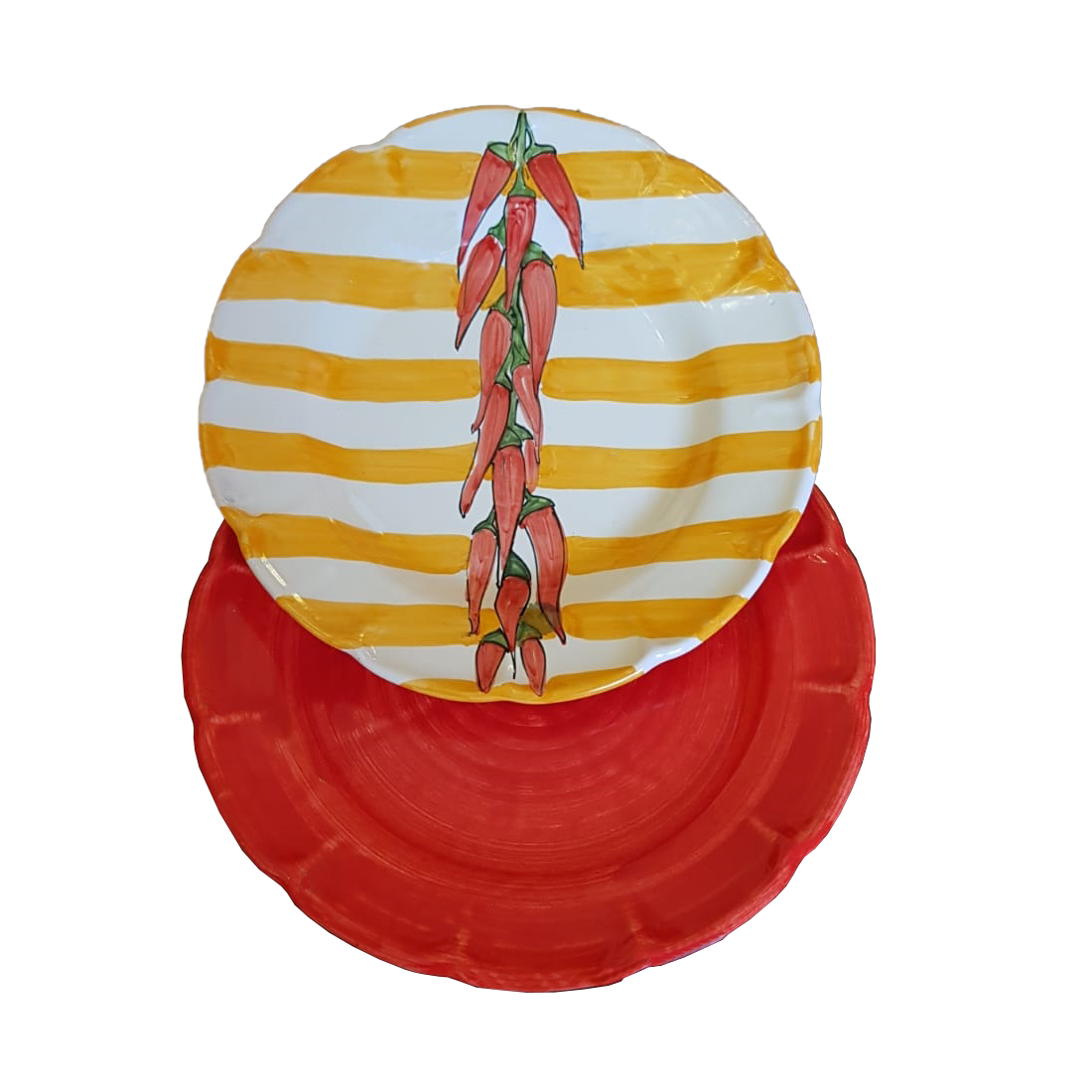 Dishes, Plates handpainted Vietri ceramic stripes and chili pepper line brushed red- Bis Soup and dinner plate