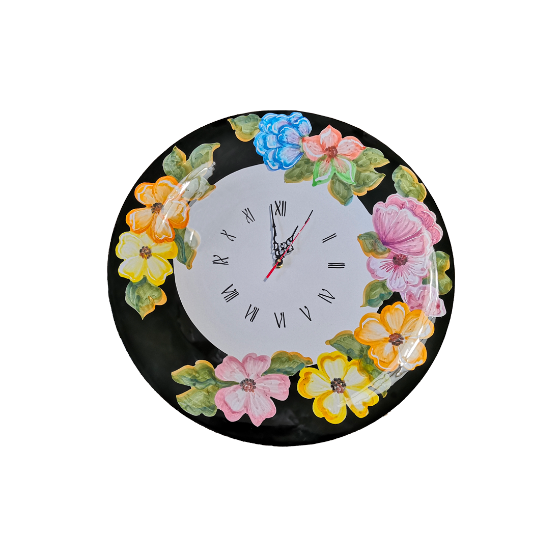 Wall clock. Black rim. Flowers line. Vietri ceramic. Hand-painted.