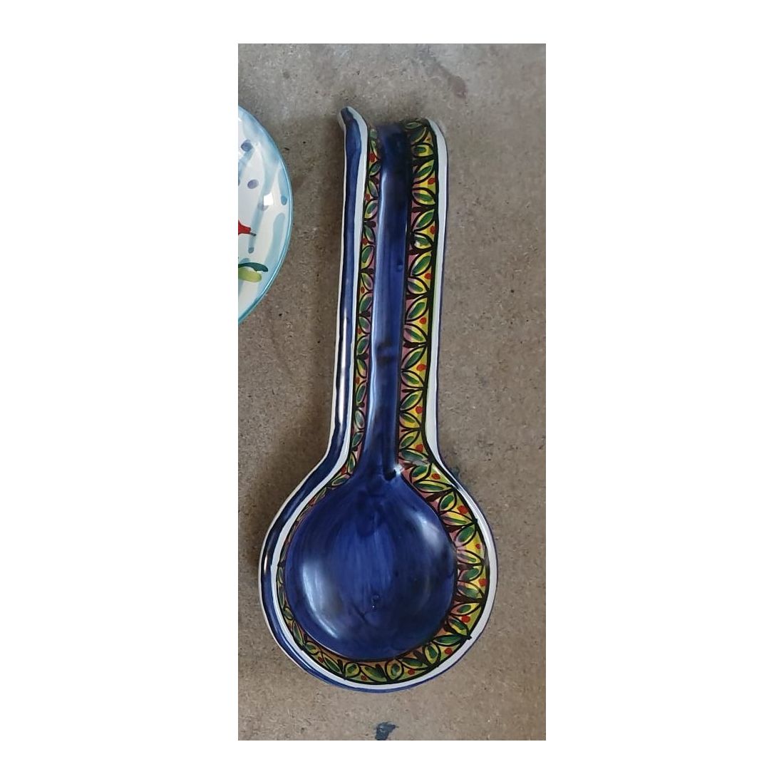 Cucharón de apoyo ROMA línea geométrica Fondo azul. Cerámica Vietri pintada a mano