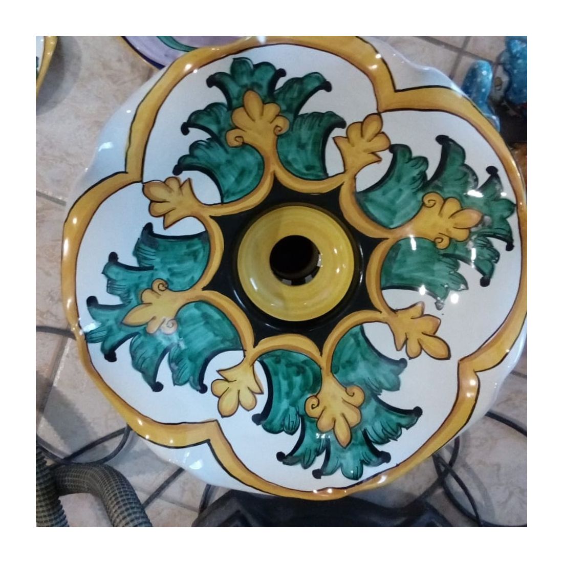 Lámpara de araña borde ondulado fondo blanco verde decoración ramina. Cerámica Vietri pintada a mano.