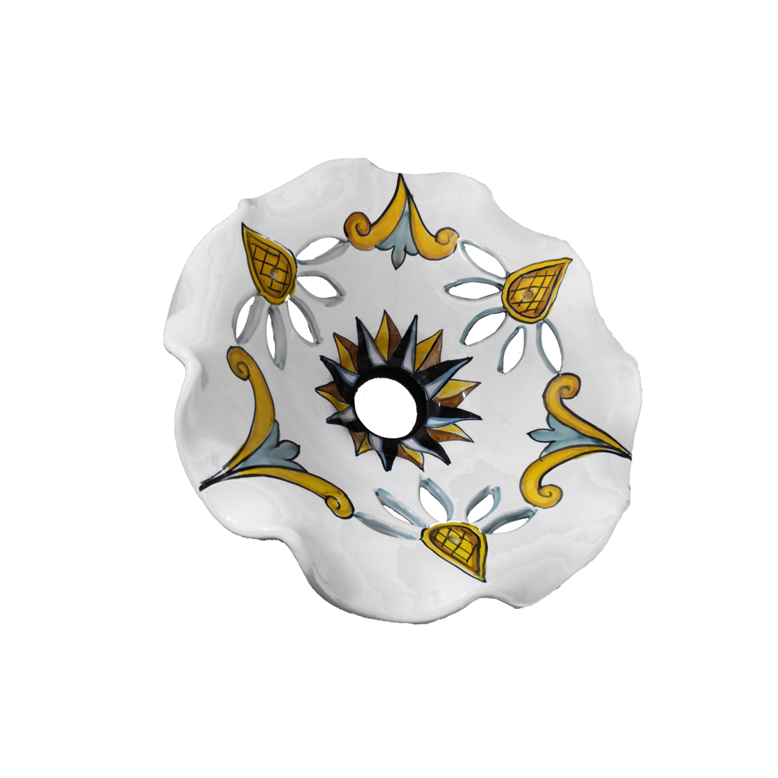 Candelabro de borde ondulado fondo blanco. Cerámica Vietri pintada a mano.