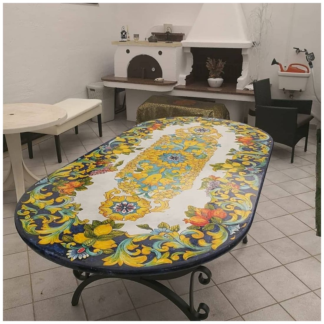 Elegante y resistente mesa artesanal hecha de piedra lávica del Etna, esmaltada y pintada a mano por maestros artesanos con los colores y la tradición de la Costa Amalfitana.