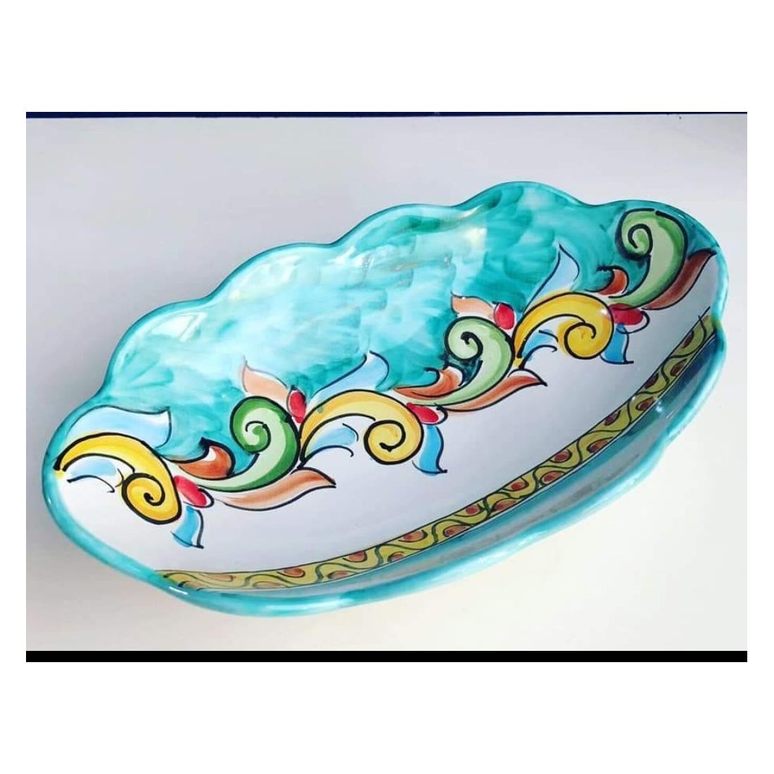Centro de mesa ovalado, línea de arlequín barroco de borde ondulado. Cerámica Vietri pintada a mano.