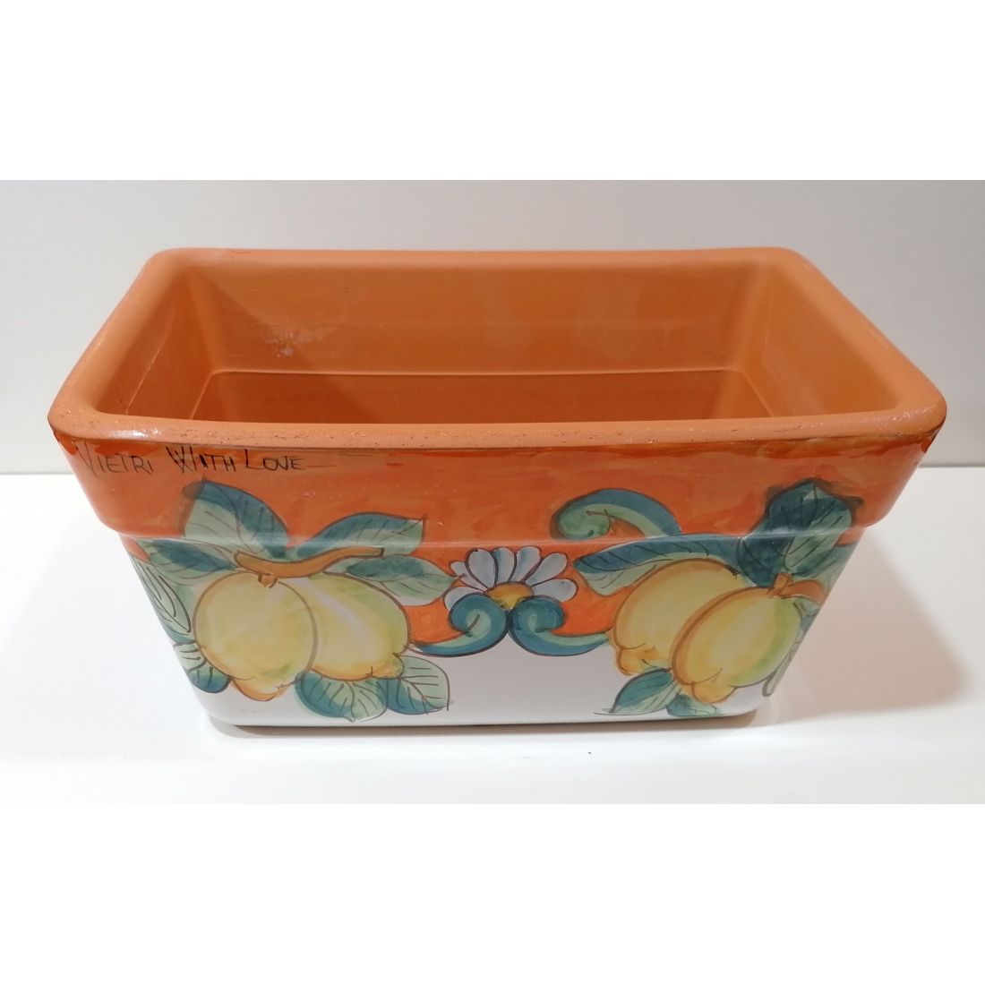 Jardinera rectangular. Fondo naranja con limones. Cerámica de Vietri. Pintada a mano.