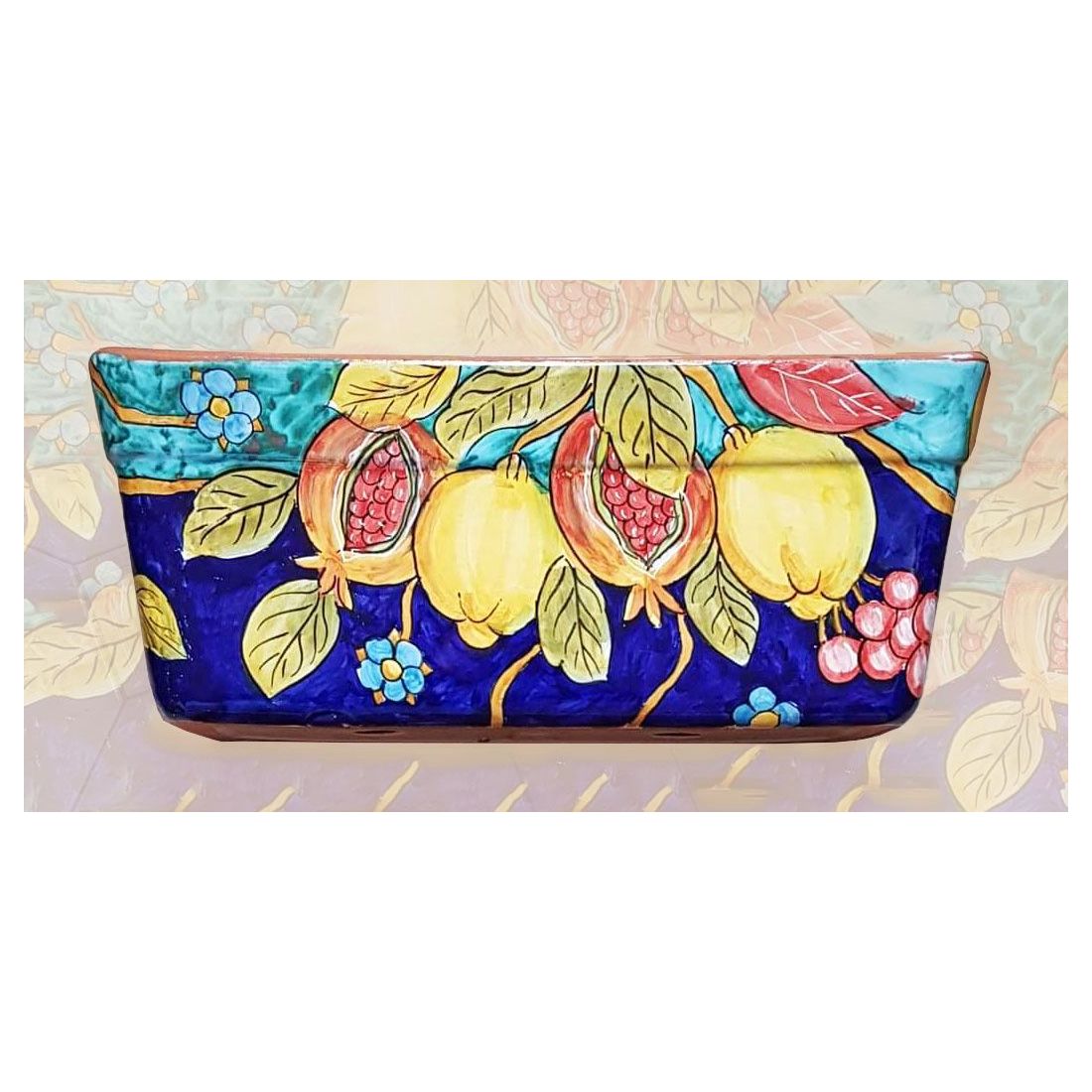 Jardinera rectangular. Fondo azul con granadas, flores y limones. Cerámica de Vietri. Pintada a mano.