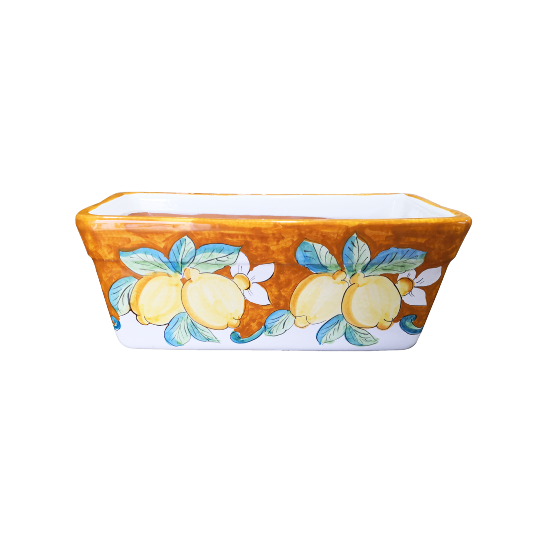 Jardinera rectangular – Fondo naranja y limones. Cerámica de Vietri. Pintada a mano