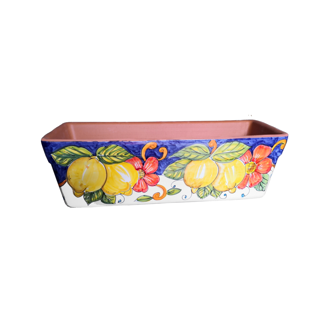 Jardinera rectangular. Fondo azul con limones. Cerámica de Vietri. Pintada a mano.
