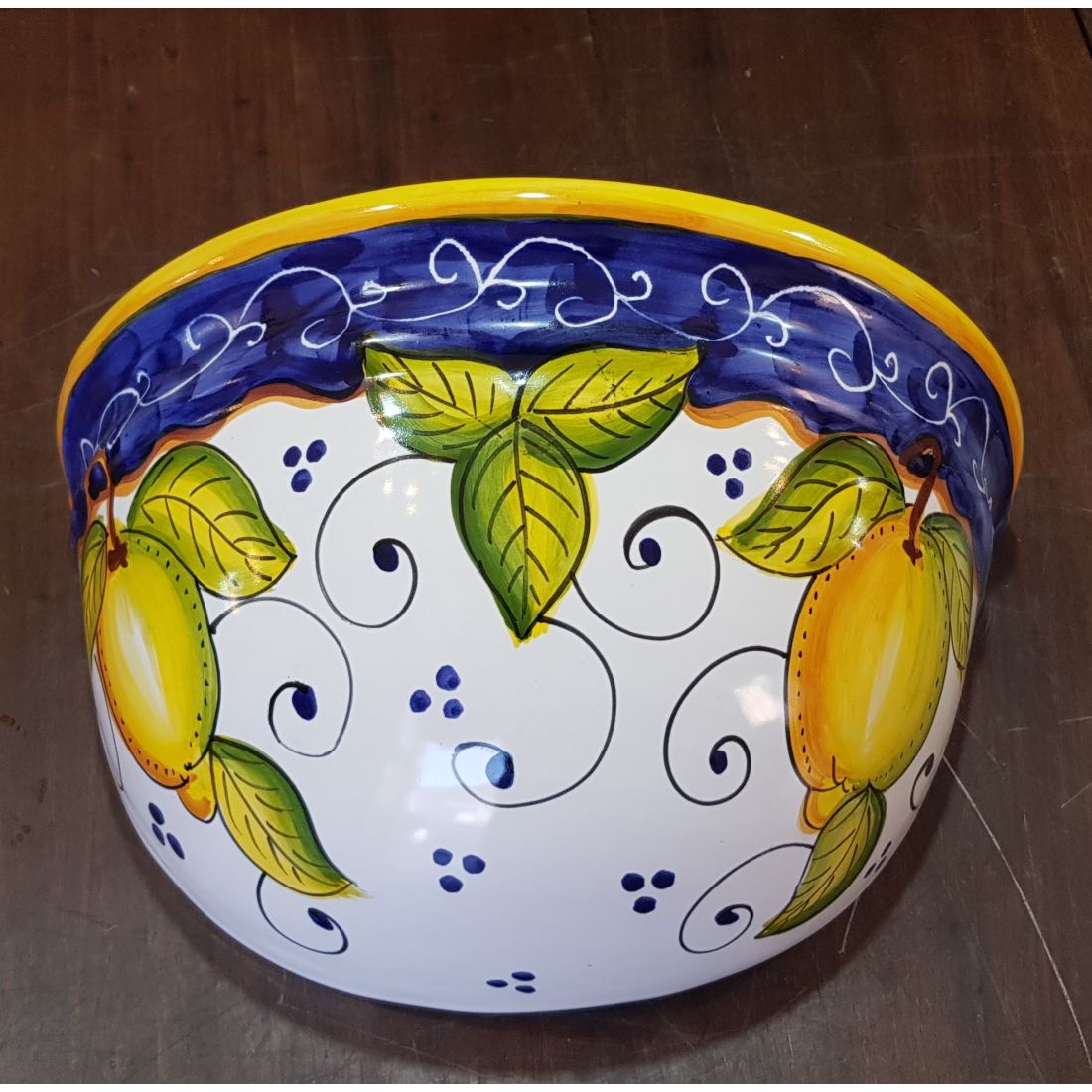 La planta de cesta lisa trae decoración floral Fondo azul. Cerámica Vietri pintada a mano.