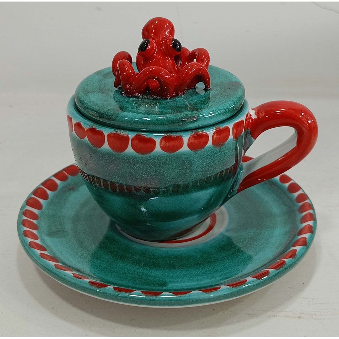 Taza de café con tapa grabada, platillo línea animal. Cerámica de Vietri pintada a mano.