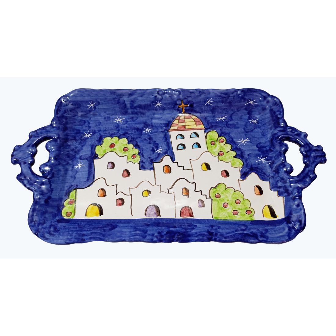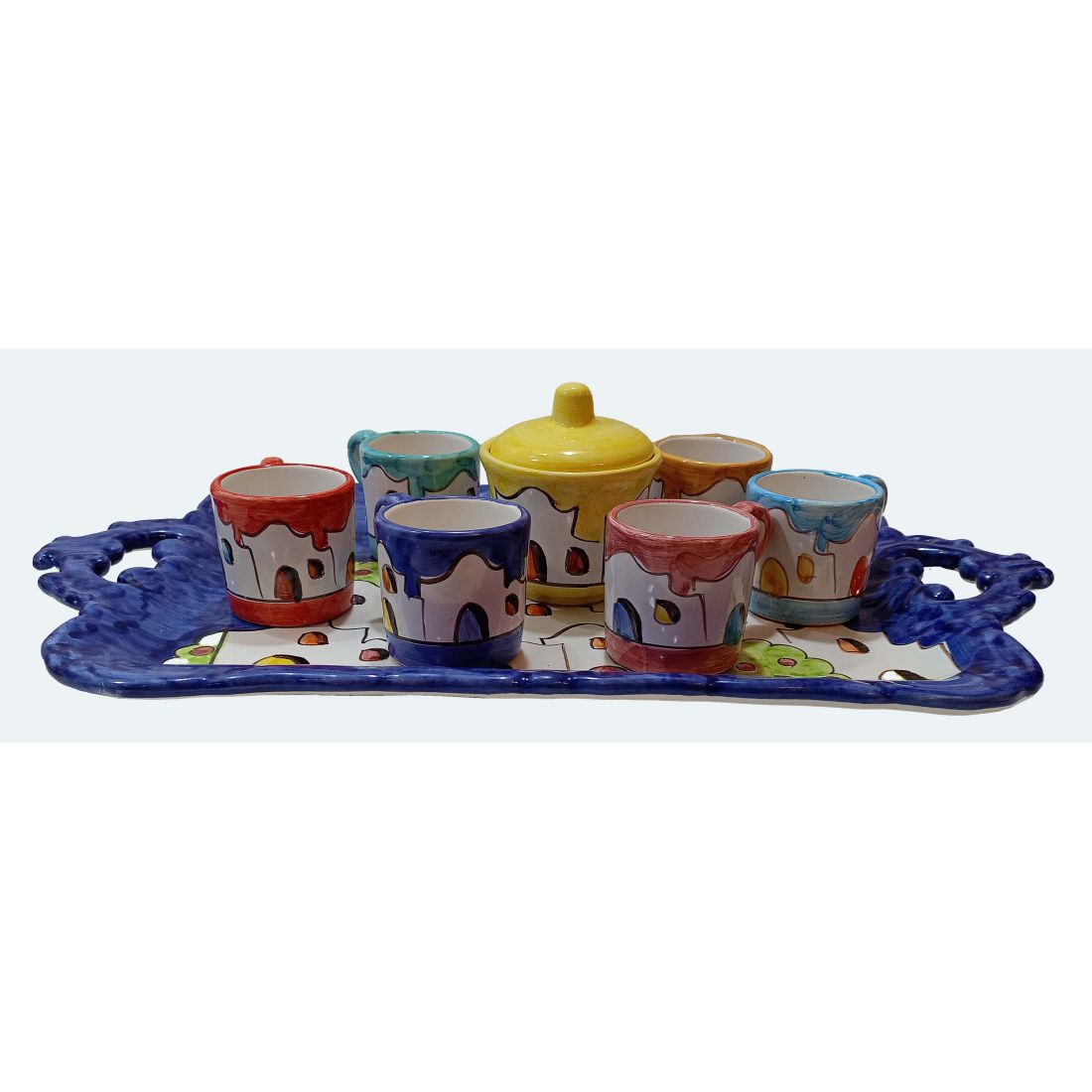Bandeja con 6 tazas y azucarero. Línea Casitas. Cerámica de Vietri. Pintado a mano.