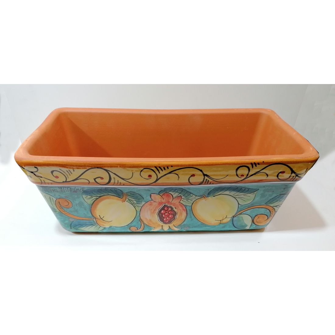 Jardinière rectangulaire. Fond vert ramina avec citrons et grenades. Céramique de Vietri. Peinte à la main.