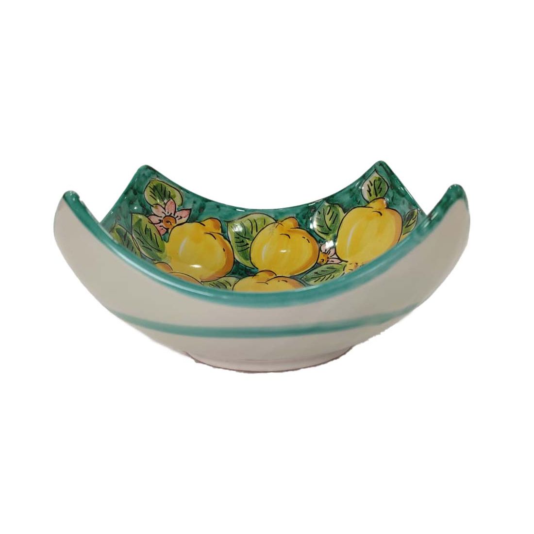Centrotavola a coppa tre manici, bordo ondulato. Ceramica di Vietri dipinta a mano.