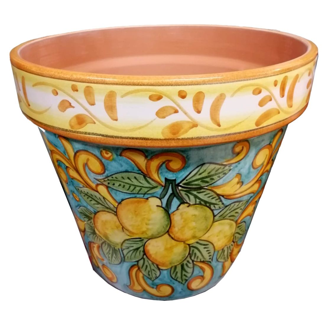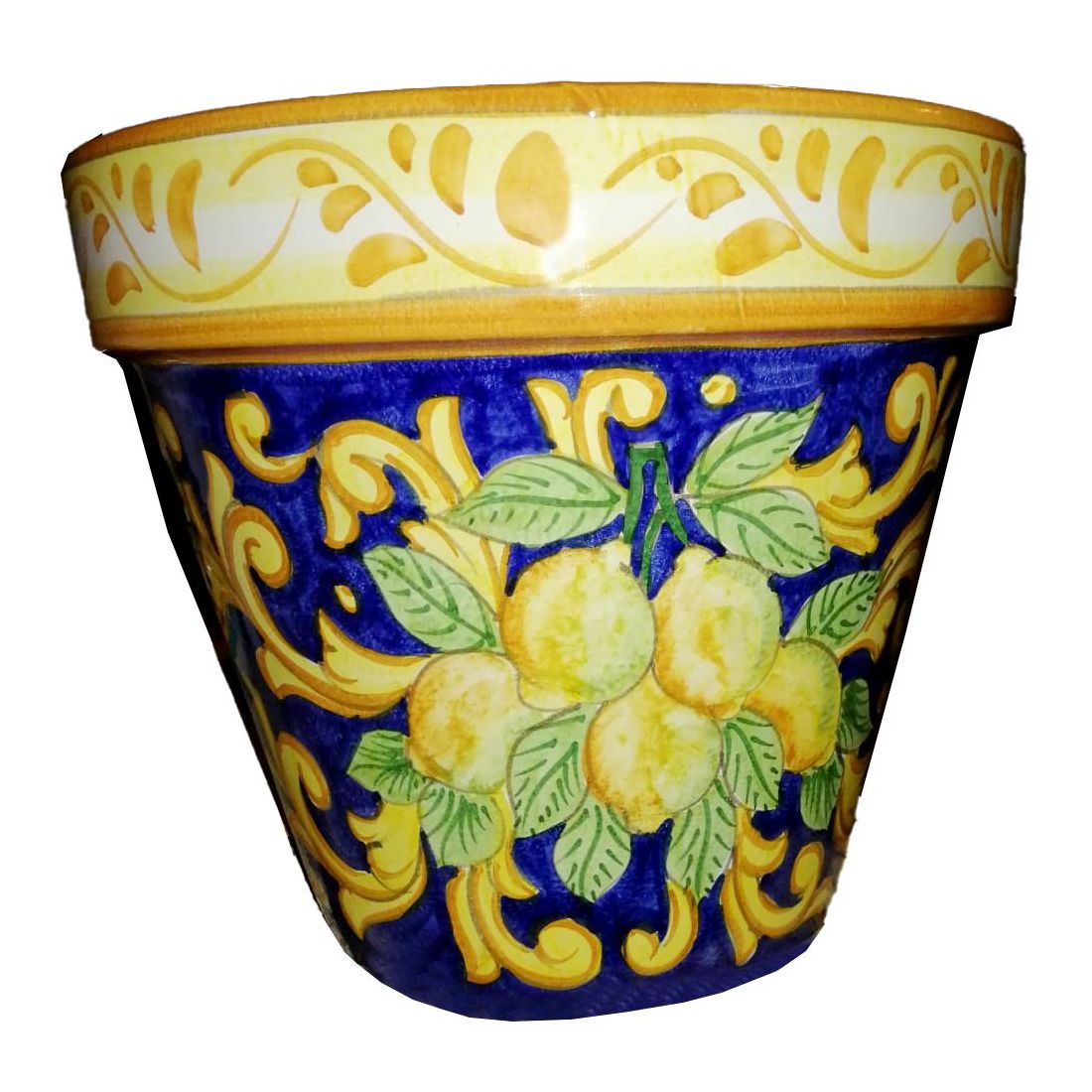 Vaso conico decoro limoni con bordo arancio. Ceramica di Vietri dipinto a mano.