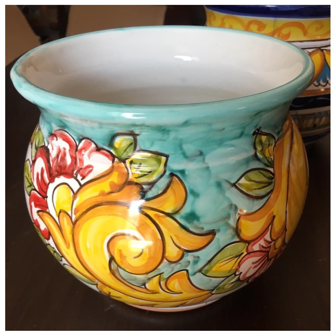 Cachepot Portapianta fondo verde ramina con decoro. Ceramica di Vietri dipinta a mano.