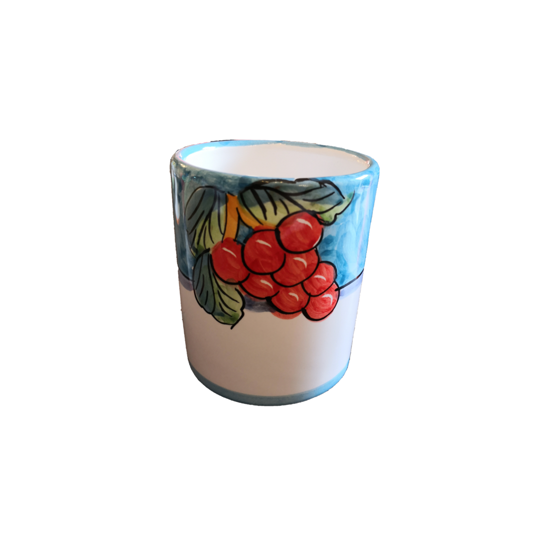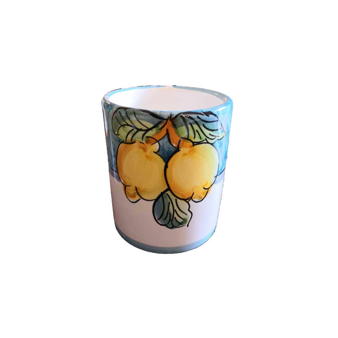 Bicchiere linea Fruttina fondo azzurro, dipinti a mano in ceramica vietrese.
