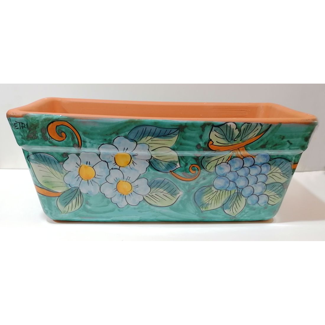 Fioriera a Cassetta Rettangolare. Fondo Verde Ramina e Fiori. Ceramica vietrese. Dipinto a mano.