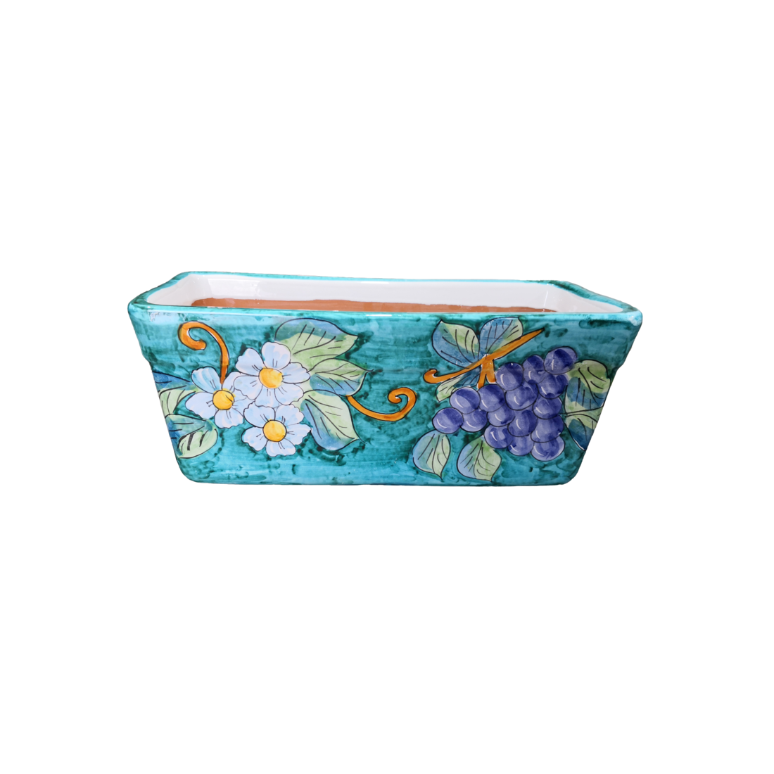 Fioriera a Cassetta Rettangolare. Fondo Verde Ramina Fiori e Uva. Dipinto a mano. Ceramica di vietri.