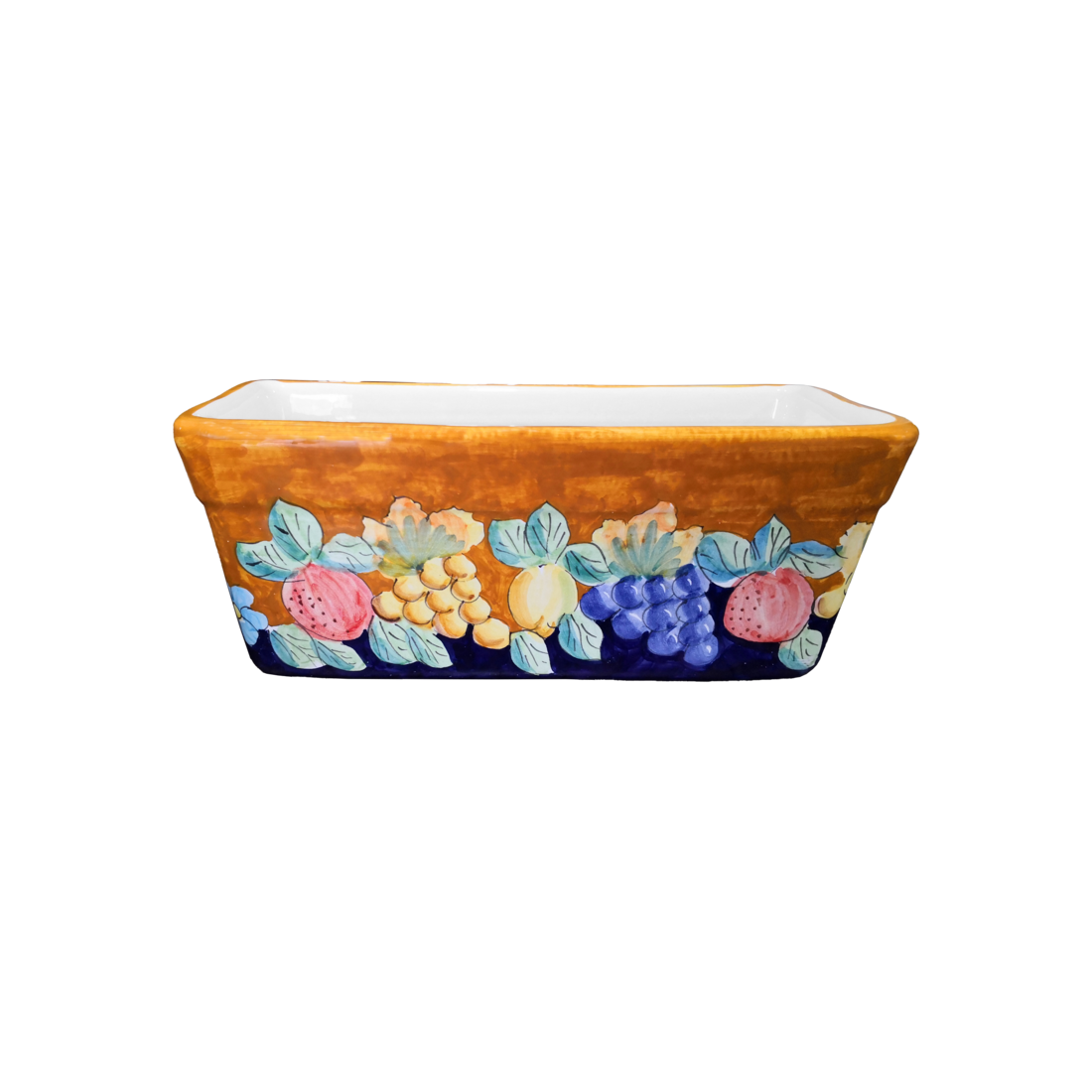 Fioriera a Cassetta Rettangolare. Fondo Arancio Fiori Uva e Limoni. Ceramica vietrese. Dipinto a mano.