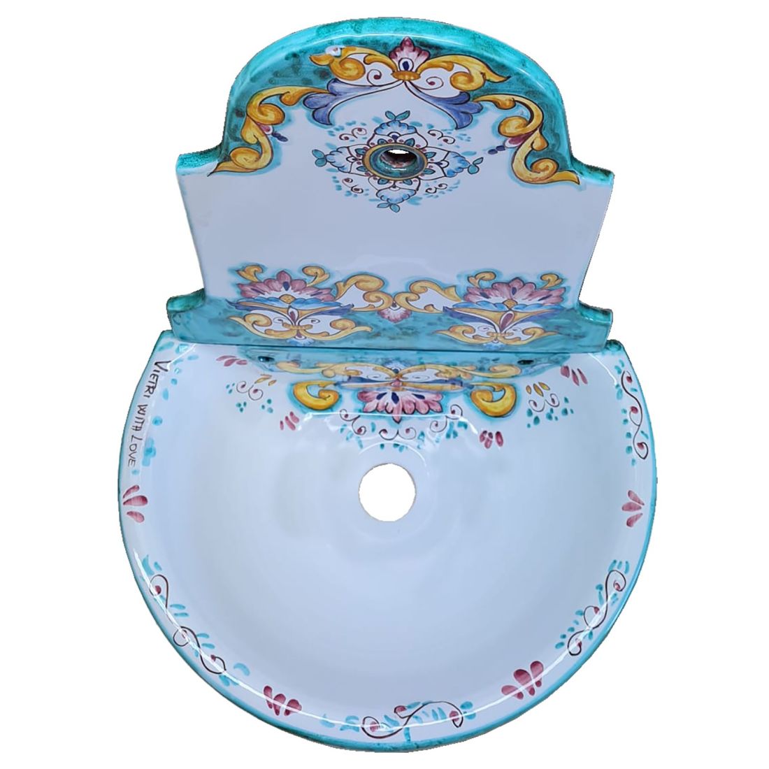 Questa fontana da muro con vasca è un’opera di artigianato vietrese realizzata e decorata interamente a mano. Le sue forme armoniose e i vivaci la rendono un elemento d’arredo capace di trasformare qualsiasi ambiente esterno in un angolo ricco di fascino mediterraneo.