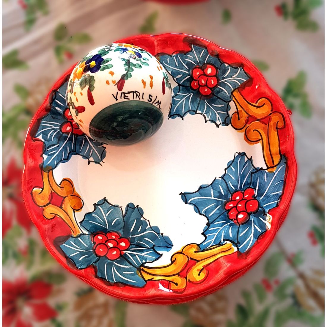 Ceramica di Vietri di altissima qualità, impreziosita da un elegante decoro natalizio, interamente realizzata e dipinta a mano da maestri artigiani che da generazioni custodiscono la tradizione ceramica vietrese.