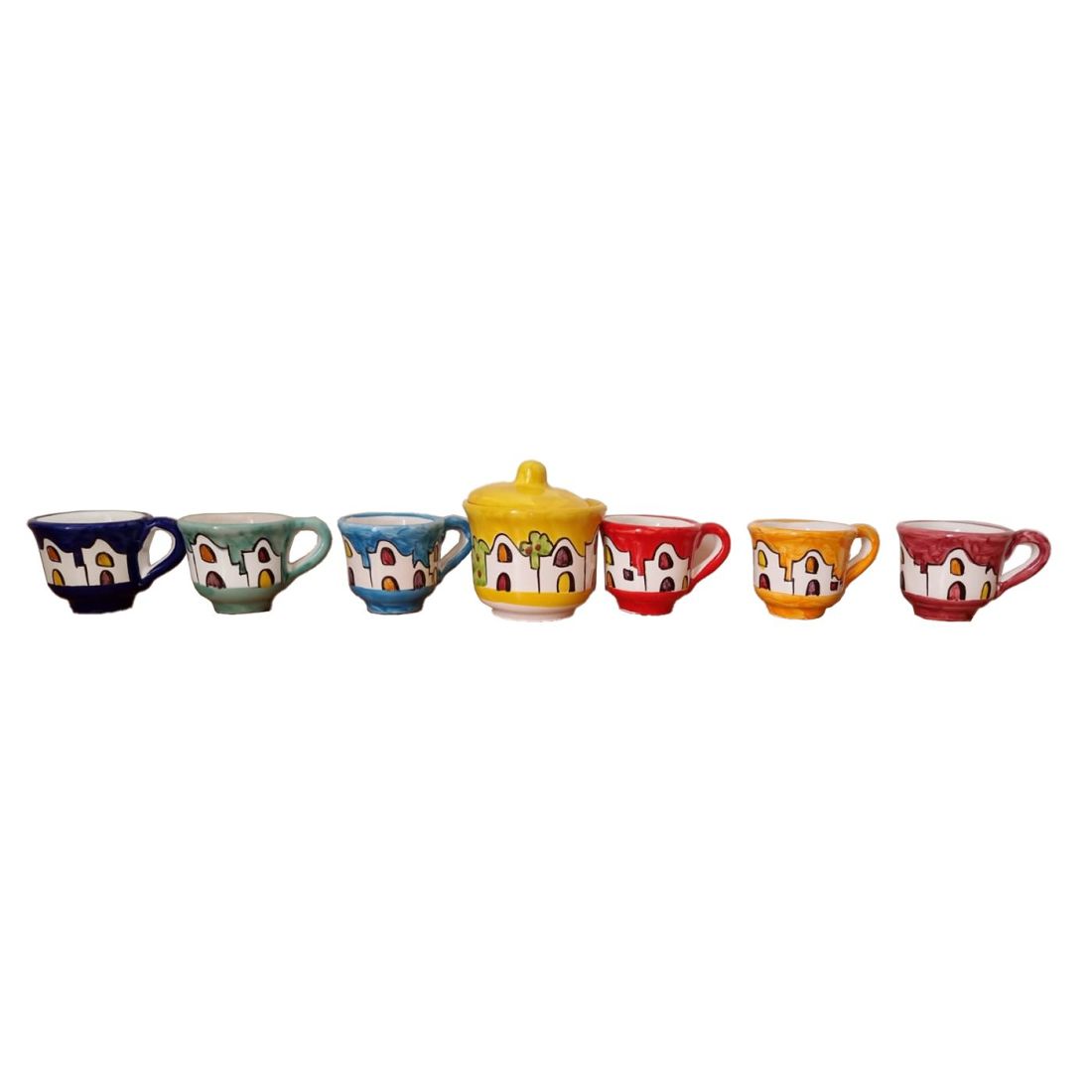 Set 12 Tazzine con vassoio e zuccheriera in ceramica di Vietri, dipinte a mano, eleganza e arte artigiana italiana.